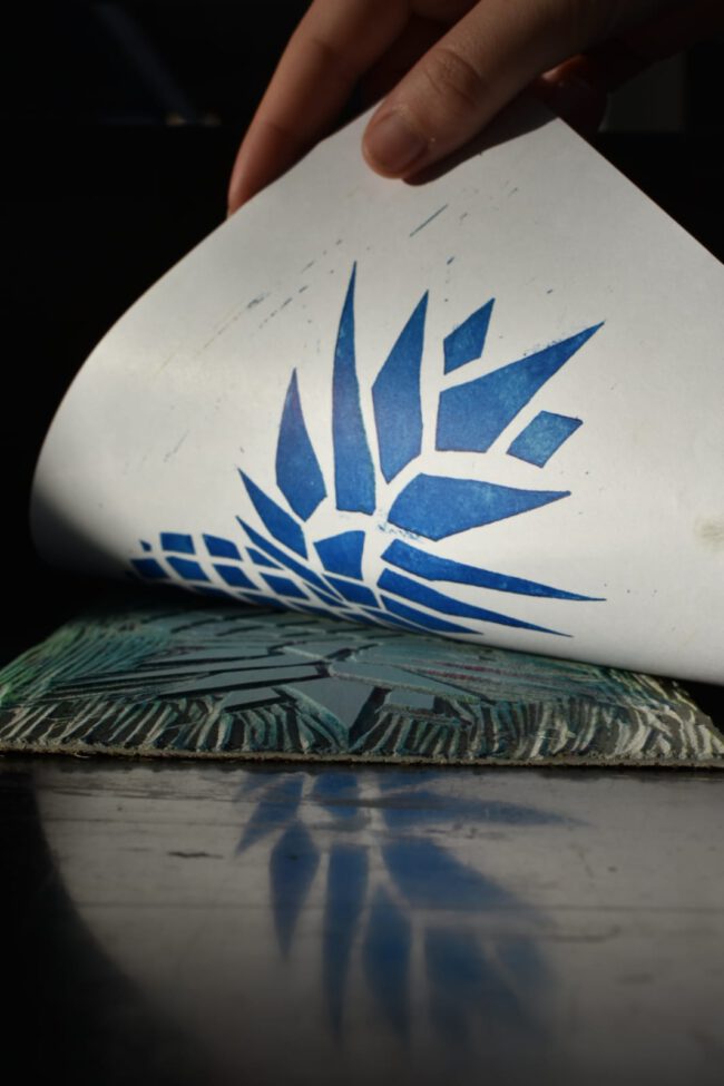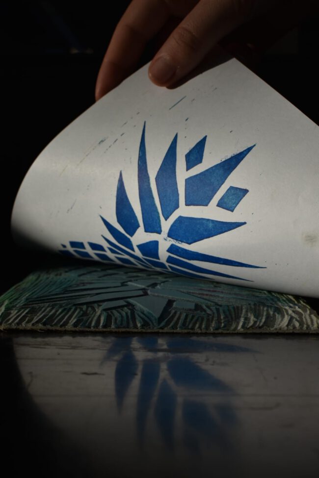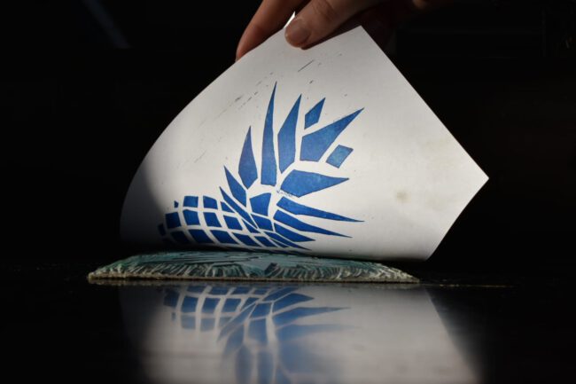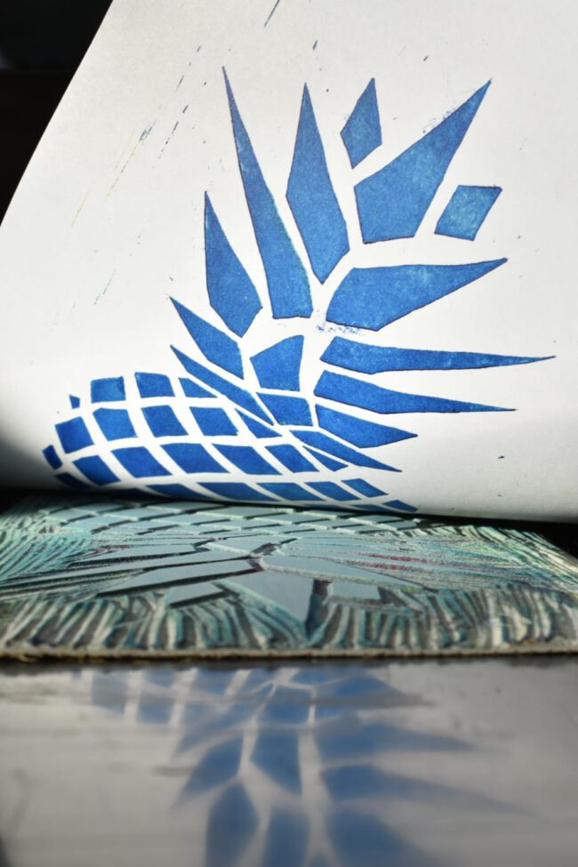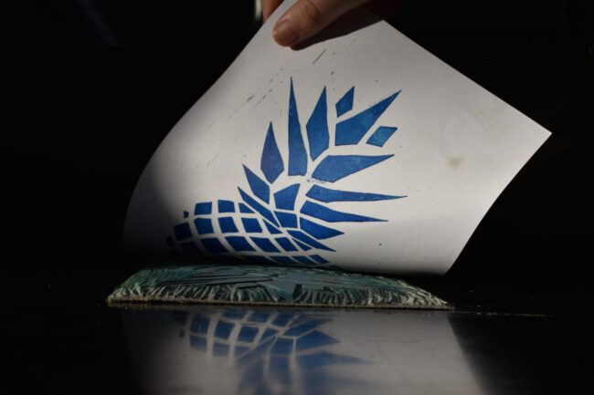 Hier in ambacht en fotografie bij elkaar gekomen. Voorgaande aan de foto’s heb ik vele variaties gemaakt van de lino ananas afdruk. Om weer te geven op welke manier dit geproduceerd word heb ik afbeeldingen gemaakt om dit te laten zien. Wat ik zo interessant aan de linoleum techniek vind is dat het nooit het zelfde is je kan er mee door blijven gaan, aanpassen en verbeteren. Elk gedeelte wat je te weinig hebt uit gegutst is zichtbaar en heeft weer een eigen handtekening.